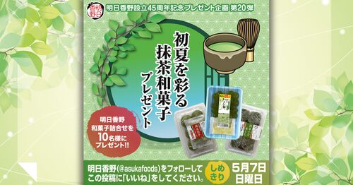菓子専科・明日香野は2022年8月15日を持ちまして、設立45周年を迎えました。現在、2023年の8月まで年間を通して途切れなく続く「明日香野45周年キャンペーン」を開催中です。2023年4月24日より、45周年キャンペーンの第20弾「初夏を彩る抹茶和菓子プレゼント…
